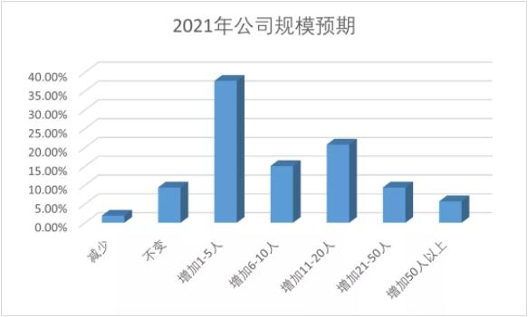 我们在调研环节增加了2021年度受访者猎企规模预期的调研项,结果显示仅不到2%的猎企会减少员工数量,10%左右的猎企规模不会有变化,大部分猎企在2021年都有增加猎企顾问的预算。