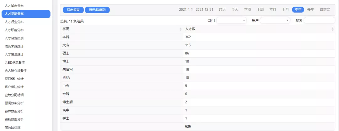 细心的朋友应该在系统报表功能里面已经发现了更多报表按钮了吧,这个功能可以让使用者一目了然的看到某一个时间段入库人才的分布情况,包含人才城市分布,学历分布,行业职能分布,简历来源分布等,可以粗略的了解自己数据库里面的人才详细分布数据。